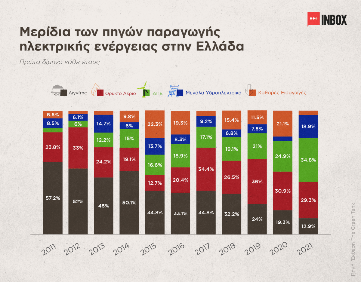 Επίσης, σύμφωνα με ανάλυση του “The GreenTank», η παραγωγή ηλεκτρισμού από λιγνίτη το 2021, σε σχέση με το 2020, μειώθηκε κατά 6,7%, ενώ συγκριτικά με το 2019 η μείωση άγγιξε το 49%.